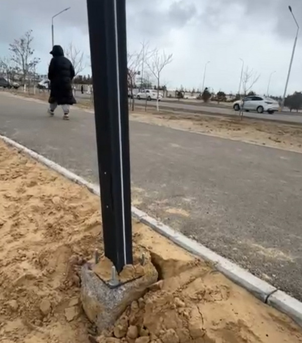 Кроме того, жители обратили внимание на опоры освещения вдоль пешеходных зон. По их утверждению, некоторые столбы выглядят неровно, а бетонное основание кажется небольшим и частично засыпано песком.