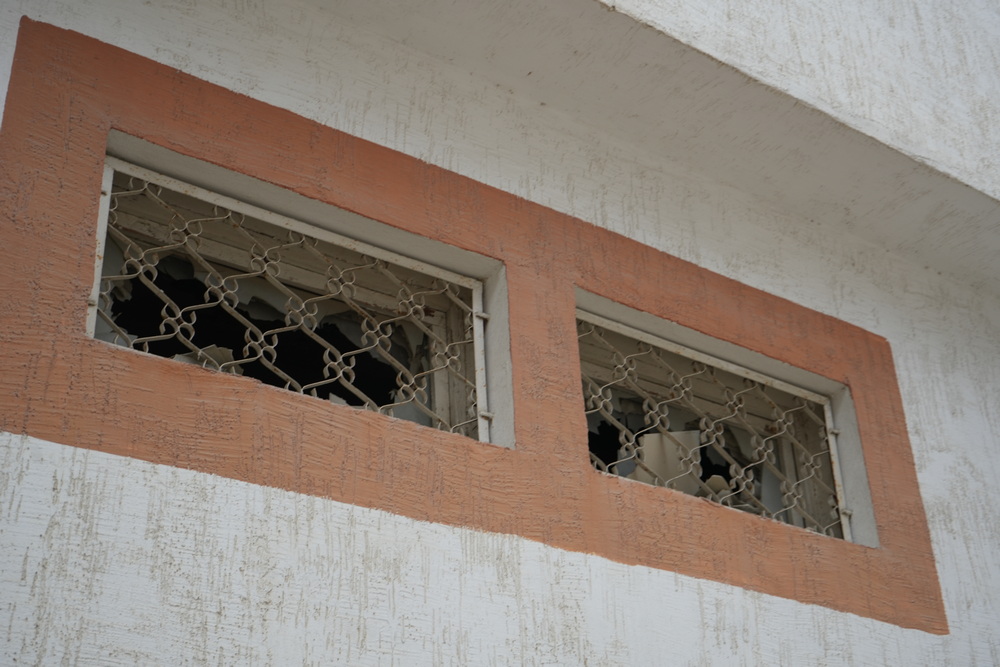 Часть окон в здании разбиты.