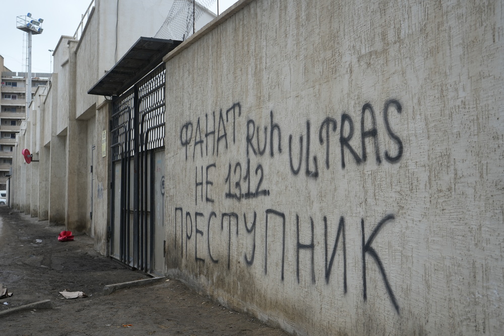 На стенах заметны надписи и следы вандализма, что не соответствует статусу объекта, который принимает футбольные матчи и связан с развитием спорта в регионе.