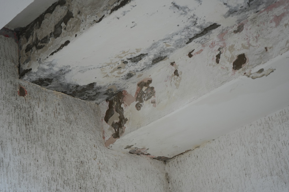 Фасад выглядит запущенным: штукатурка местами осыпалась, краска облупилась, а под козырьками и перекрытиями видны потемневшие участки, свидетельствующие о длительном воздействии влаги.