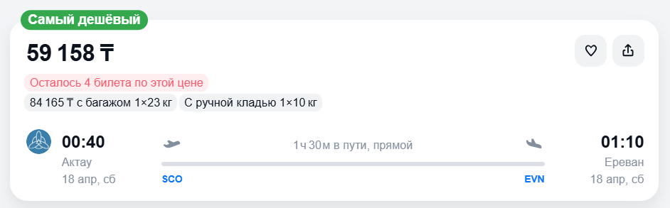 Стоимость билетов на сегодняшний день в один конец составляет 59 158 тенге.