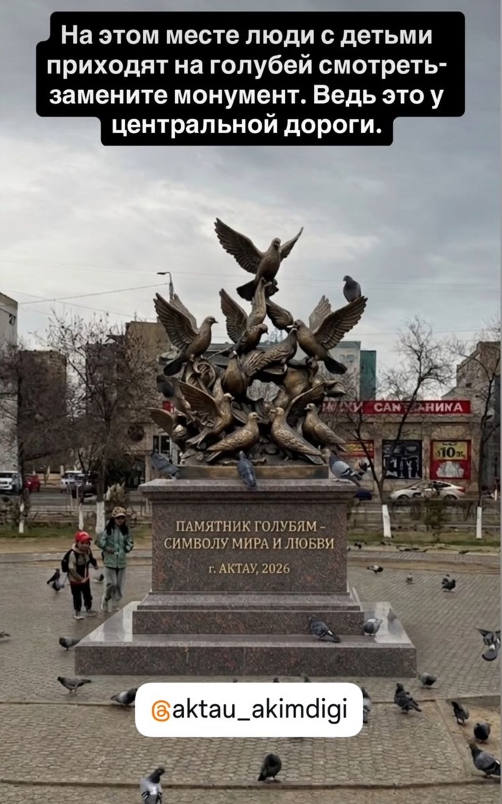 Жители Актау в социальных сетях предложили необычную инициативу – установить памятник голубям в 12 микрорайоне вместо старой малой архитектурной формы. По их мнению, голуби стали неотъемлемой частью аллеи, посвящённой первым геологоразведчикам Мангистауской области, передает Lada.kz.