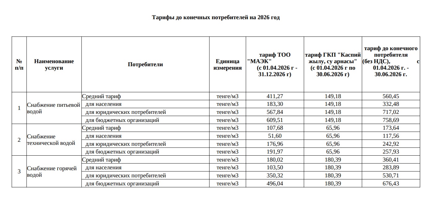 Так, тариф МАЭКа на питьевую воду для юрлиц повысился на 6,2% (с 674,62 до 717,02 тенге), бюджетных организаций – на 5,4% (с 719,63 до 758,69 тенге).