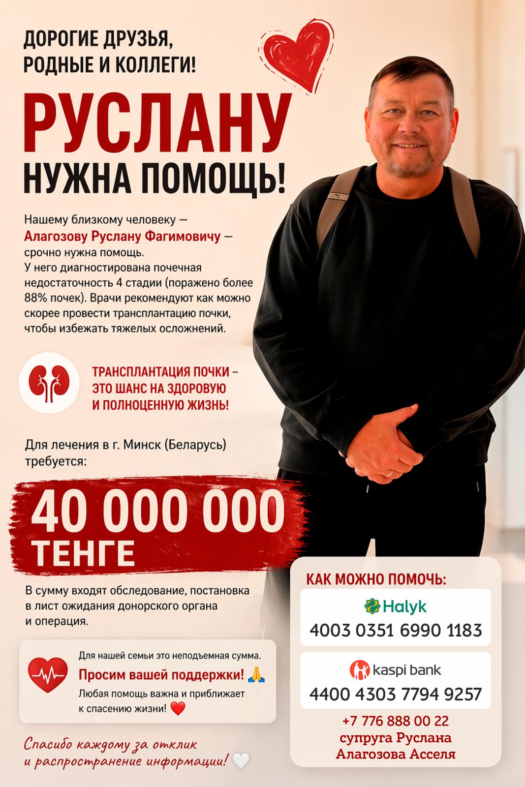 Связаться с семьей и отправить материальную помощь можно по номеру телефона супруги Руслана – Ассели Алагозовой: +7 (776) 888-00-22 (карты Kaspi и Halyk привязаны к номеру).