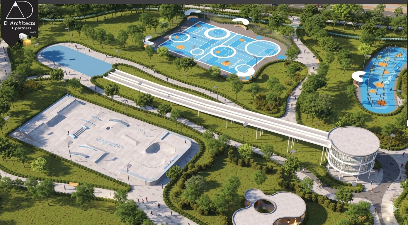 Для активного отдыха предусмотрены детские и спортивные площадки, скейт-парк, интерактивные зоны и сухой фонтан. Кроме того, проект учитывает круглогодичное использование территории – зимой здесь планируют обустраивать каток и ледяные горки.