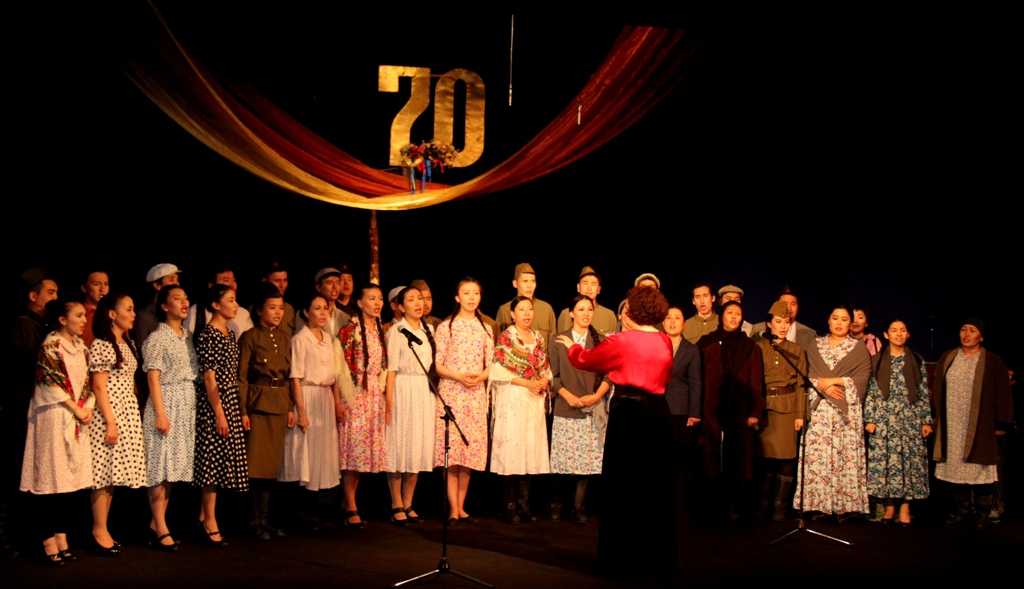 В программу спектакля-концерта вошли фрагменты постановки трагедии Чингиза Айтматова «Ана-Жер ана», выступление хора актеров театра. В их исполнении прозвучали песни о подвиге солдат, военные песни – «Алия», «Смуглянка», «Катюша», «День Победы» и др.