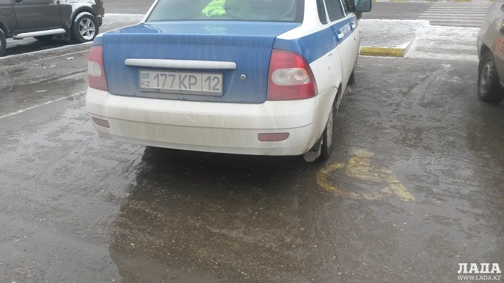 было опубликовано фото патрульного автомобиля, припаркованного на стоянке для инвалидов в Актауском аэропорту.