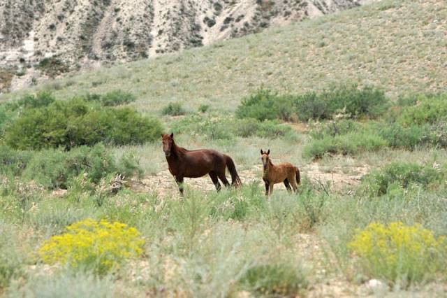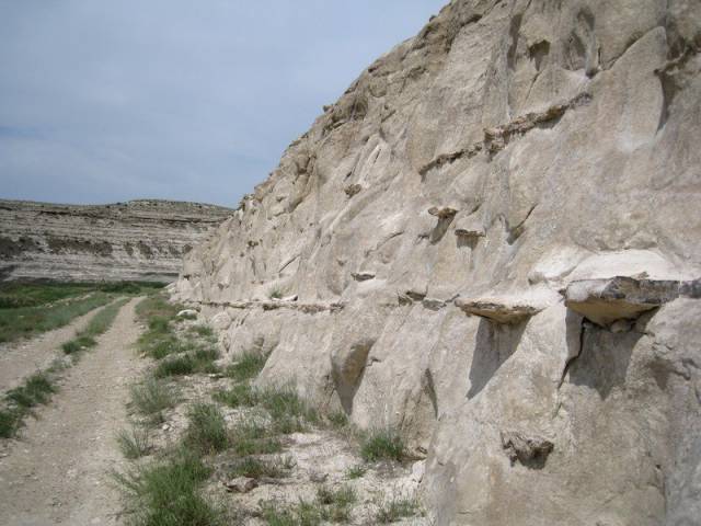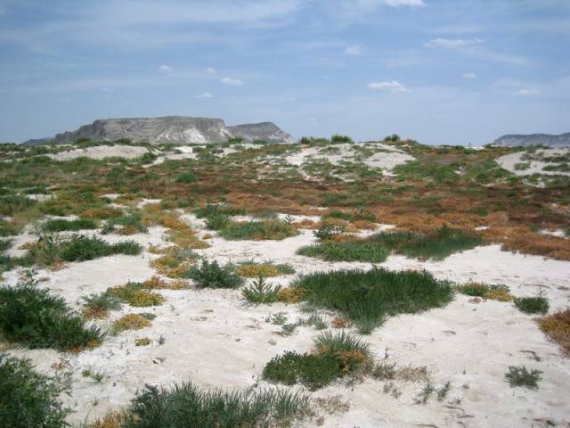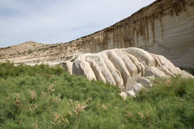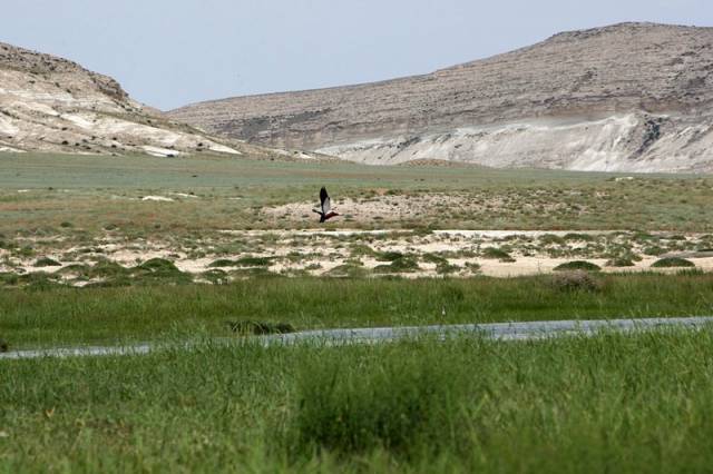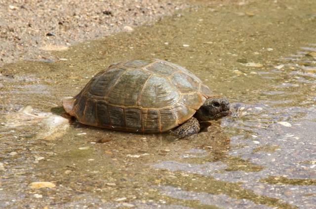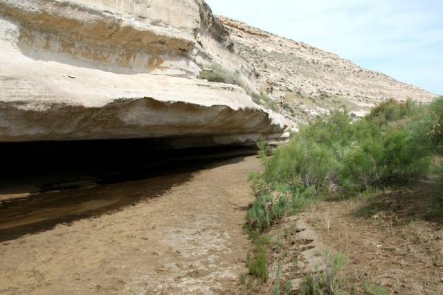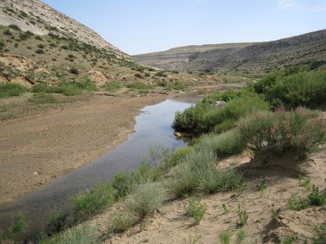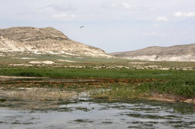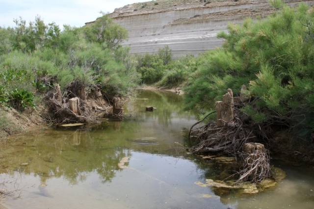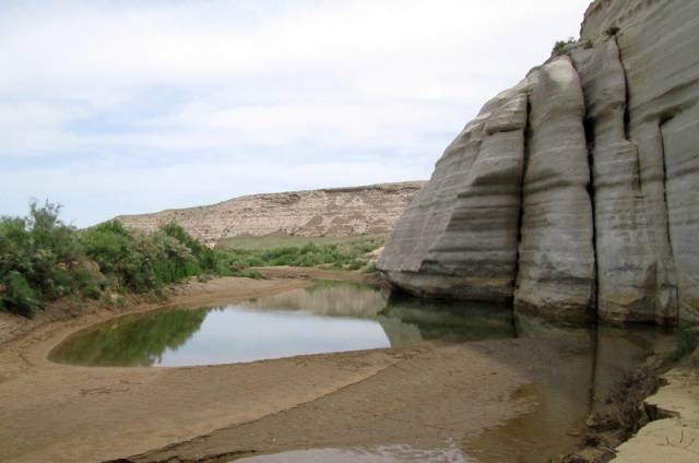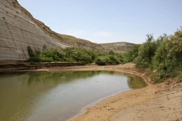 Впервые за 30 лет жизни на Мангышлаке мне удалось побывать в урочище Кумакапе, что севернее Таучика. Через все ущелье протекает речка, образуя небольшие заводи, в которых даже можно искупаться. Есть тут и свои обитатели: черепахи, кеклики, кулики. Обратный путь наш лежал через урочище Карасай.