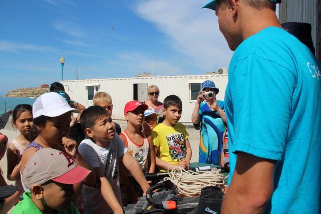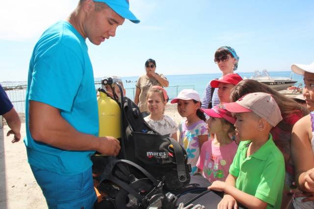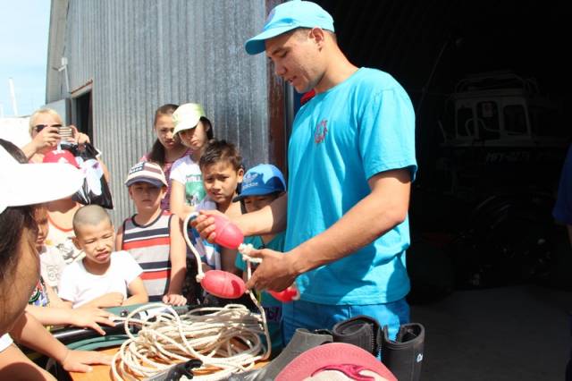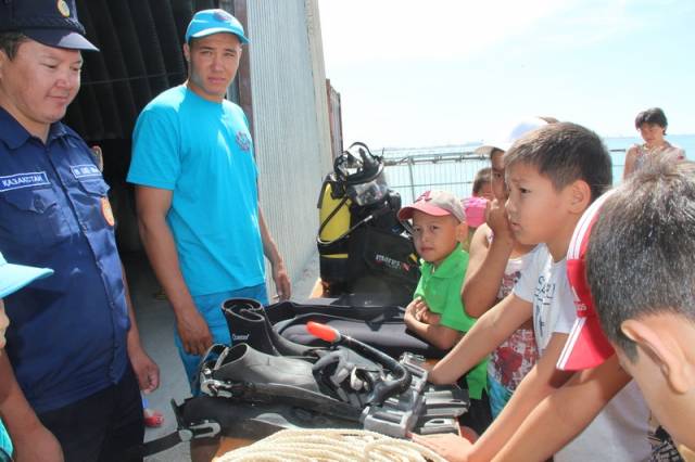 Сотрудник оперативно-спасательного отряда ДЧС Мангистауской области Дамир Русинов представил вниманию ребят специальное снаряжение водолазов, рассказал о его предназначении, и какую роль оно играет при спасении людей. Дети с любопытством разглядывали костюмы водолазов, специальную утяжеленную обувь, пояса и другие приспособления для подводной работы спасателей, после чего смогли примерить их на себя.