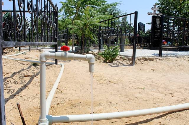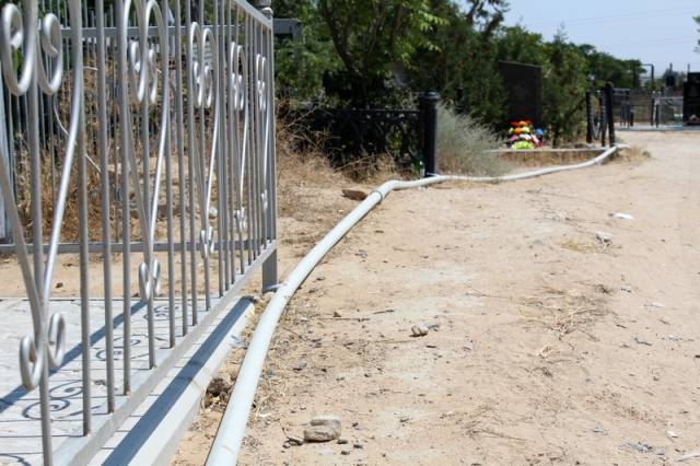 Как рассказал Молдабай Джанаев, пластиковый трубопровод установлен по всей территории городского кладбища. Проложено свыше 2800 метров трубы (диаметром 40 мм, толщина стенки 8 мм). Насчитывается более 230 кранов для подачи воды через каждые 64 метра. Вода подведена ко всем емкостям, расположенным на территории.