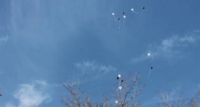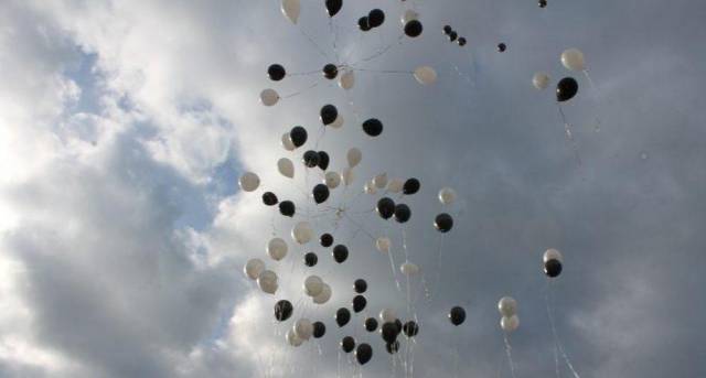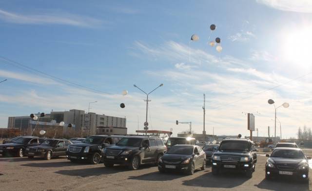 Одновременно водители выпустили в небо белые и черные воздушные шары. После колонна из 15 черных автомашин с белыми ленточками проехала по городу.