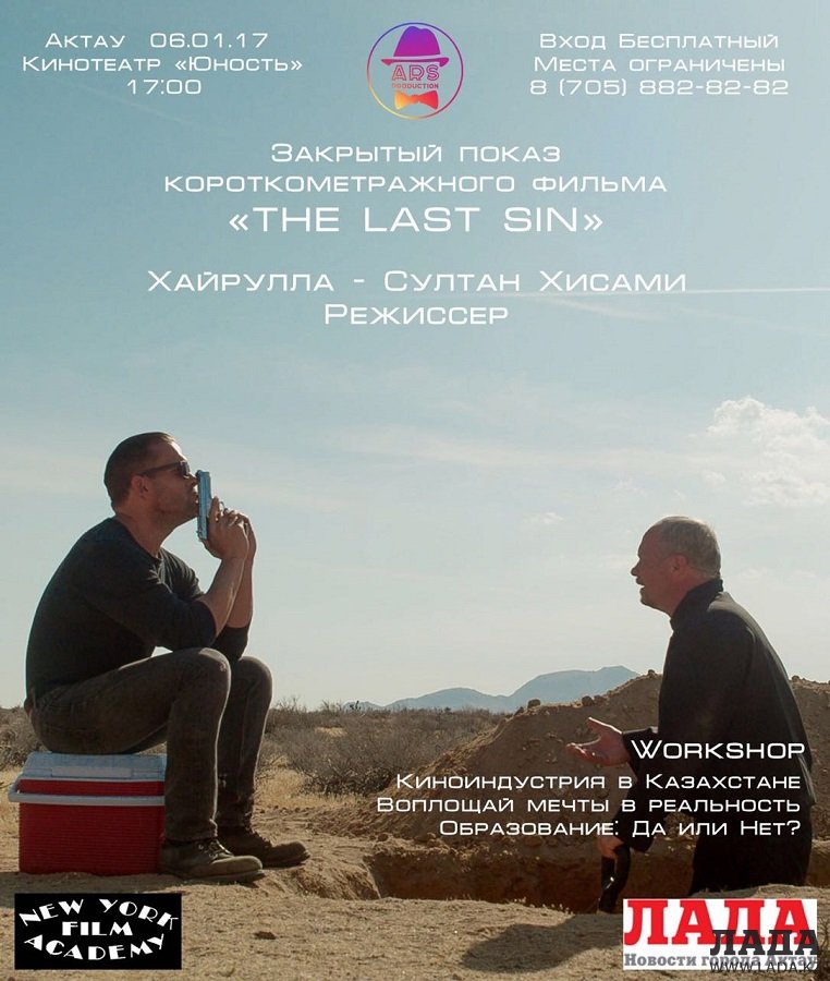 Жители Актау смогут посетить закрытый показ фильма «The Last Sin» и мастер-класс по режиссуре. В нем примет участие режиссер, студент Нью-Йоркской Академии кино Хайрулла-Султан Хисами. Организатором выступит агентство «Ars production».