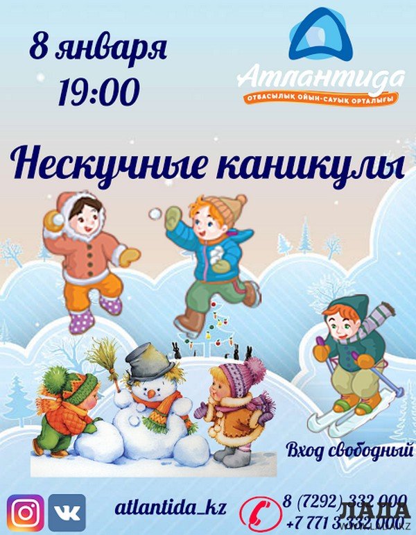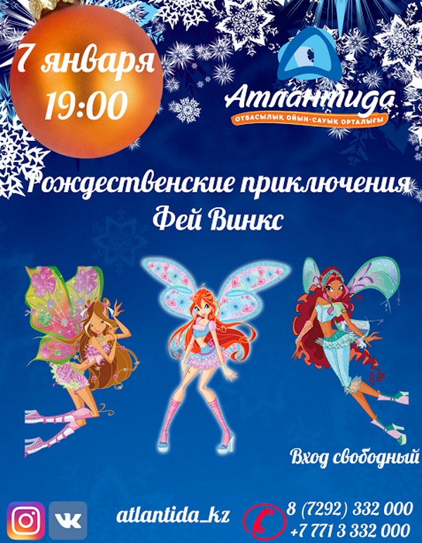 В семейном развлекательном центре «Атлантида» еженедельно в пятницу, субботу и воскресенье проходят зажигательные шоу-программы с участием веселых аниматоров. В субботу, 7 января, пройдет вечеринка «Рождественские приключения Фей Винкс». Все желающие могут принять в ней участие, вход бесплатный. Начало в 19:00. А в воскресенье, 8 января, пройдет увлекательная программа «Нескучные каникулы». Отличное времяпрепровождение для всей семьи. Вход бесплатный. Начало в 19:00.