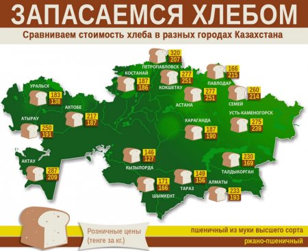 По итогам января текущего года цена на пшеничный хлеб по Казахстану выросла в среднем на 8,6%, из ржано-пшеничной смеси - на 7,8%. Наиболее недорогой хлеб из пшеничной муки первого сорта поднялся в цене заметнее всего - сразу на 17% - до 122,4 тенге за кг.