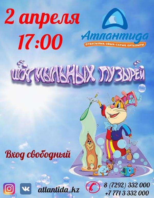 В семейном развлекательном центре «Атлантида» еженедельно в пятницу, субботу и воскресенье проходят зажигательные шоу-программы с участием веселых аниматоров. Отличное времяпрепровождение для всей семьи. Вход бесплатный. Место проведения: семейный развлекательный центр «Атлантида», расположенный на четвертом этаже универсального торгового центра «Заман». Вход бесплатный.