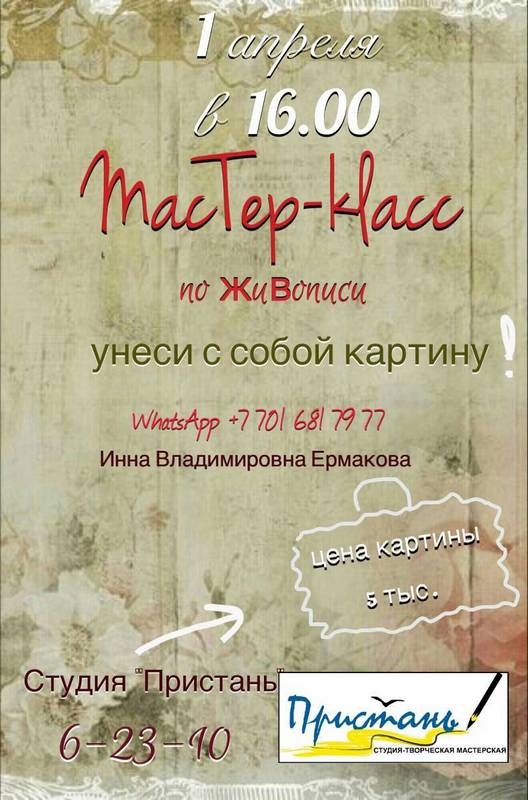 Студия «Пристань» 1 апреля в 16:00 проводит мастер-класс по живописи для взрослых. Приглашаем всех желающих открыть в себе творческое начало, окунуться в удивительный мир искусства, почувствовать себя художником. Стоимость картины, которую вы сами напишите на холсте и унесёте с собой - 5 000 тенге. Все материалы включены. Телефоны для записи: 8 701 681 79 77. Рабочий: 53-05-85.