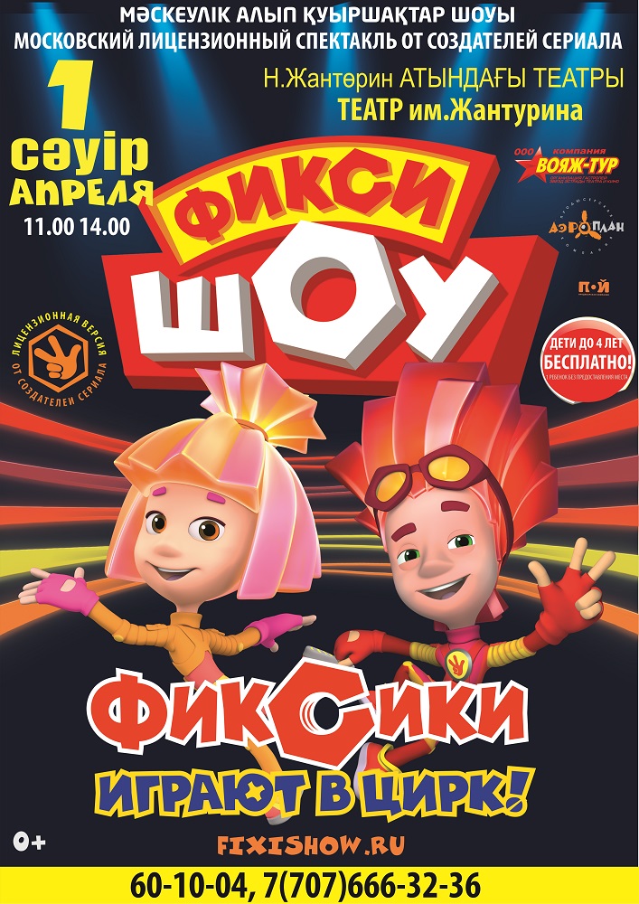 Новые приключения уже полюбившихся героев. На «Фикси-шоу» дети смогут воочию увидеть любимых героев. Это интерактивный спектакль-«хеппенинг»: он позволит каждому ребенку принять участие в удивительных приключениях фиксиков прямо во время представления. Каждый малыш окажется вовлеченным в действие и почувствует себя нужным и незаменимым. На этот раз наши друзья фиксики приглашают всех поиграть в Фикси-цирк! Лучший друг фиксиков – Дим Димыч – не мог пропустить такого веселья и с радостью вернулся в мир фиксиков. Разбираемся в цирковых чудесах, учимся жонглировать и показывать фокусы все вместе! Наше представление будет наполнено играми, фиксипелками и танцами. Продолжительность спектакля 1 час. Только 1 апреля в театре имени Н. Жантурина. Телефон кассы: 60-10-04, 8 707 666-32-36.
