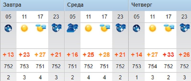 В среду, 26 июля, синоптики прогнозируют ясную погоду. Средняя температура воздуха днём +27°С, ночью +21°С. Ветер 3-4 м/с.