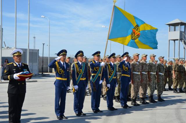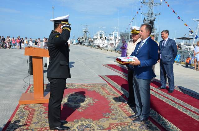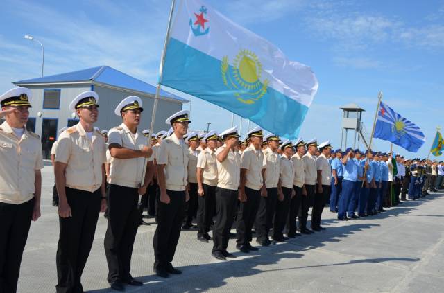 Флаг военно-морских сил Казахстана впервые был поднят 17 августа 1996 года капитаном 1 ранга Русланом Исламовым.