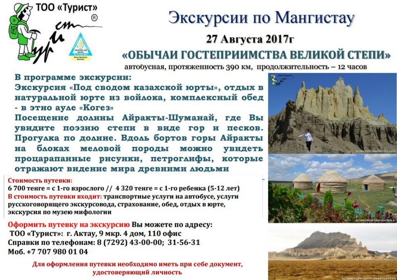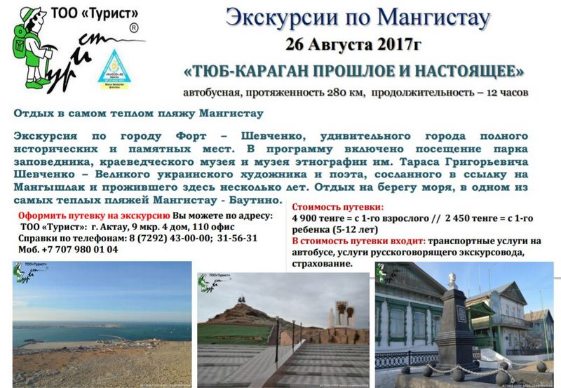 ТОО «Турист» приглашает жителей Актау 26 августа на экскурсию! Поездка платная. Предварительная запись по телефонам: 43-00-00, 31-56-31, 8 707 980 0104.