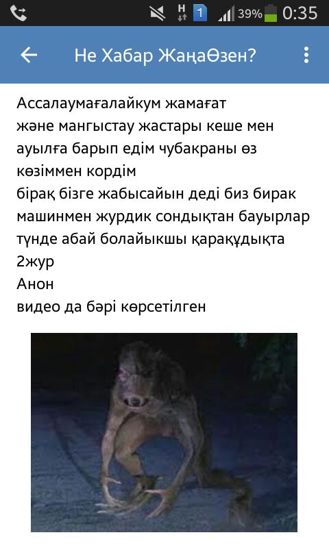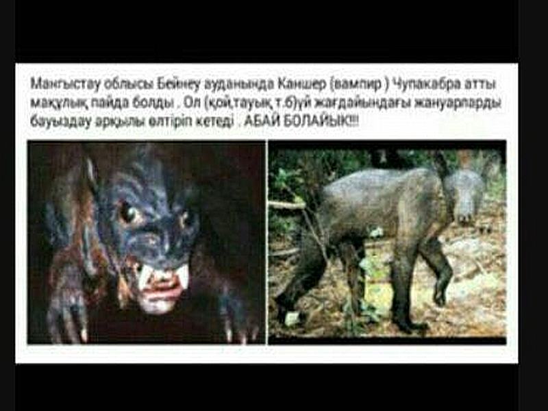 Жители Мангистау пересылают друг другу в мессенджерах и социальных сетях сообщения о некоем звере «чупакабра», который нападает по ночам на домашний скот. В сообщениях говорится, что в селе Каракудук в Каракиянском районе некое существо убивает домашних животных и пьет их кровь. Рассылаемую в социальных сетях Актау информацию не подтвердили ни в прокуратуре Жанаозена, ни в РОВД Каракиянского района.