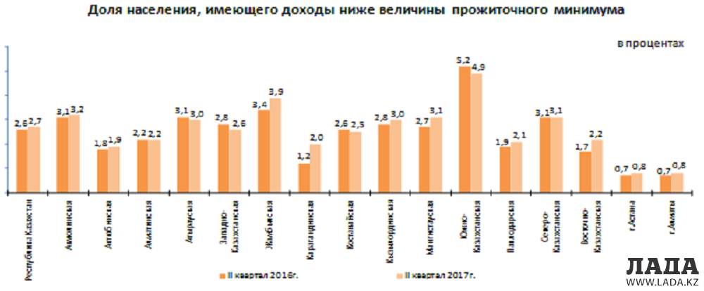 Наибольший уровень бедности, по данным Комитета статистики, зарегистрирован в Южно-Казахстанской (4,9%), Жамбылской (3,9%) и Акмолинской области (3,2%). Мангистауская и Северо-Казахстанская область делят четвертую позицию.