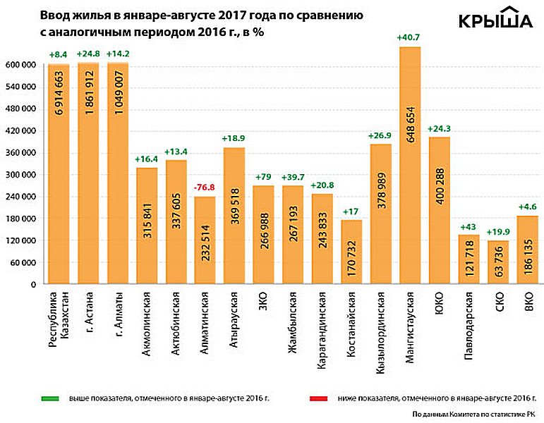 Количество введённых в стране квартир с начала года достигло 60 690 единиц, что на 11.6 процента выше соответствующего периода 2016 года. Большая часть из них — 17 941 квартира — приходится на Астану. Также в тройке лидеров Алматы - 8 072 квартир и Мангистауская область - 5 455.