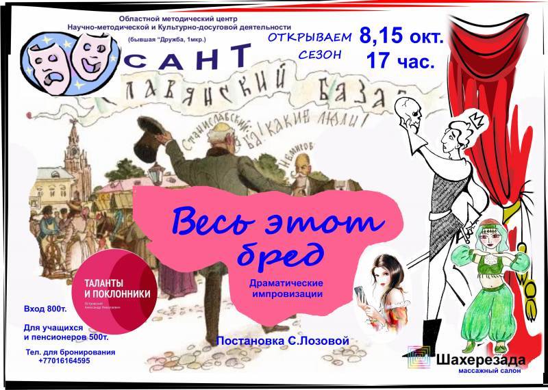 В воскресенье, 8 октября, в 17:00 в театре САНТ пройдет открытие очередного театрального сезона! В этот вечер зрители смогут увидеть, как и чем живут актеры в свои обычные будни. Творческая работа и житейские проблемы. Увлекательные театральные импровизации на тему драматических пьес. Музыка. Актерские байки. Место и время проведения: областной методический центр научно-методической и культурно-досуговой деятельности, 1 микрорайон. Телефон для справок: 8 701 616 4595