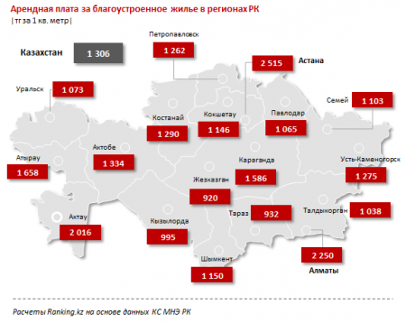 Самая низкая арендная плата зафиксирована в Жезказгане — 920 тенге за квадратный метр. Средняя стоимость аренды жилья в Казахстане, по данным Ranking.kz, составила 1 306 тенге за квадратный метр.
