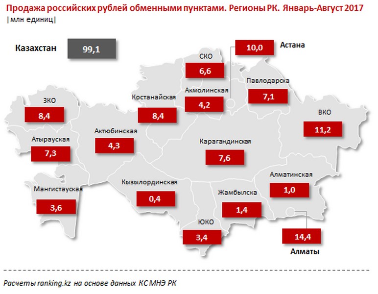 В продаже американской валюты лидируют обменные пункты Алматы - 3,0 миллиарда долларов. Следом идет Астана - 789,4 миллиона долларов. Замыкает тройку лидеров Южно-Казахстанская область. В обменных пунктах здесь продано 731,6 миллиона долларов. Жители Мангистауской области с начала года приобрели 305,3 миллиона долларов.