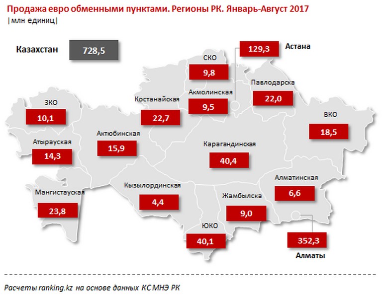 Продажи европейской валюты, как сообщает Ranking.kz, выросли почти в полтора раза и составили 728,5 миллиона евро, годом ранее - 493,9 миллиона.