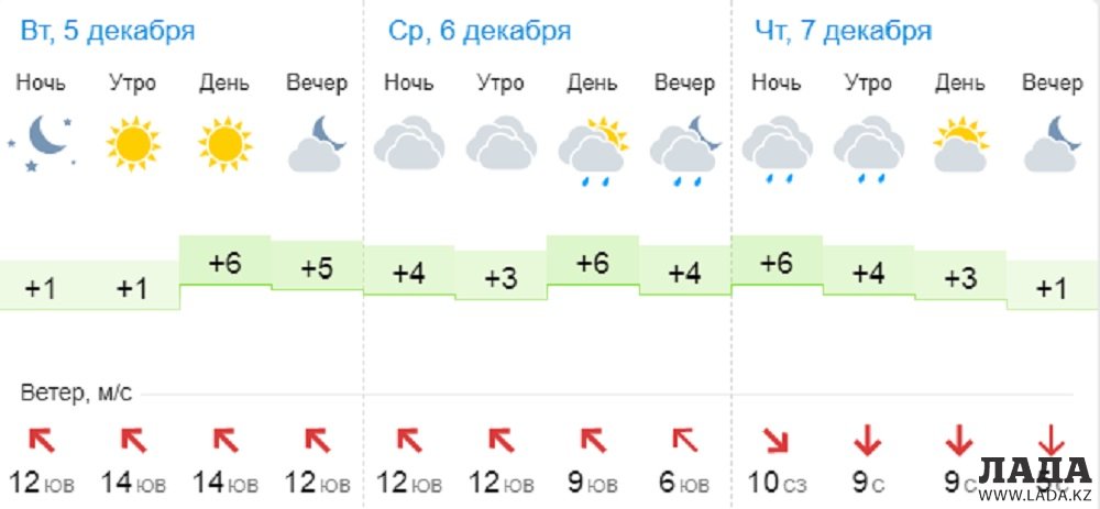 В среду, 6 декабря, в Актау, по прогнозам синоптиков, будет дождь. Температура воздуха днём составит +6°С, ночью +4°С. Ветер 11-12 м/с.