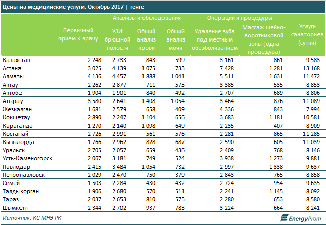Самый дорогой прием врача – в Алматы (4136 тенге). УЗИ стоит в среднем 4457 тенге, а общий анализ крови – 1888 тенге.