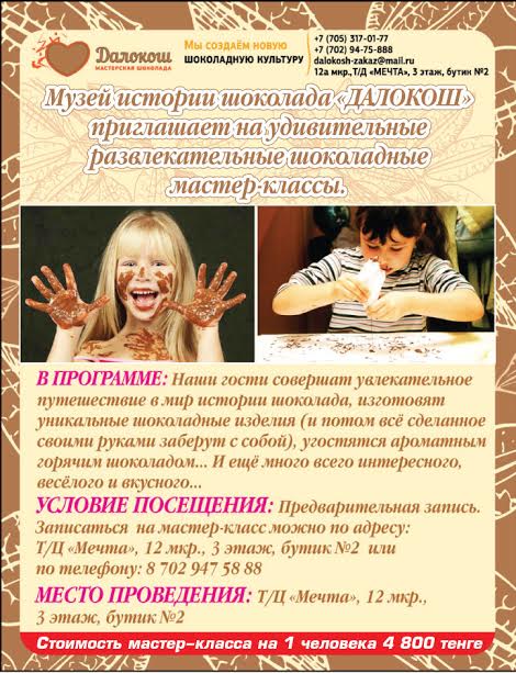Подарите своим детям два часа приятной атмосферы и море шоколадного удовольствия. Музей истории шоколада «Далокош» приглашает на развлекательные мастер-классы. Наши гости совершат увлекательное путешествие в мир истории шоколада, изготовят уникальные шоколадные изделия (и потом все сделанное своими руками унесут с собой), угостятся ароматным шоколадом... И еще много всего интересного, веселого, вкусного. Стоимость мастер-класса на одного человека - 5000 тенге. Условия посещения: предварительная запись. Записаться на мастер-класс можно по адресу: торговый дом «Мечта», 12 микрорайон, 3 этаж, бутик №2 или по телефону: 8 702 947 5888.