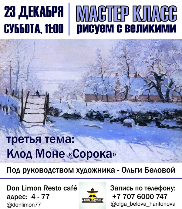 Организаторы предлагают написать зимний снежный пейзаж Клода Моне «Сорока».