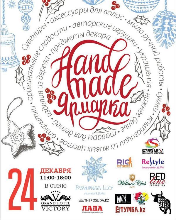 Handмade-ярмарка вновь откроет свои двери 24 декабря в «Гранд Отель Виктори» (13 микрорайон, здание 25А, 2 этаж) с 11:00 до 18:00. Вход свободный.