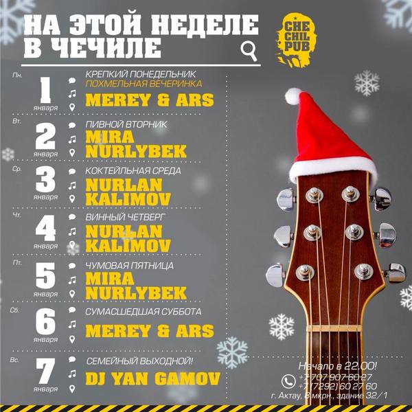 В субботу в Chechil Pub пройдет вечеринка «Сумасшедшая суббота». Жителей Актау ждет выступление группы Merey ARS. Место проведения: 8 микрорайон, 32 здание.