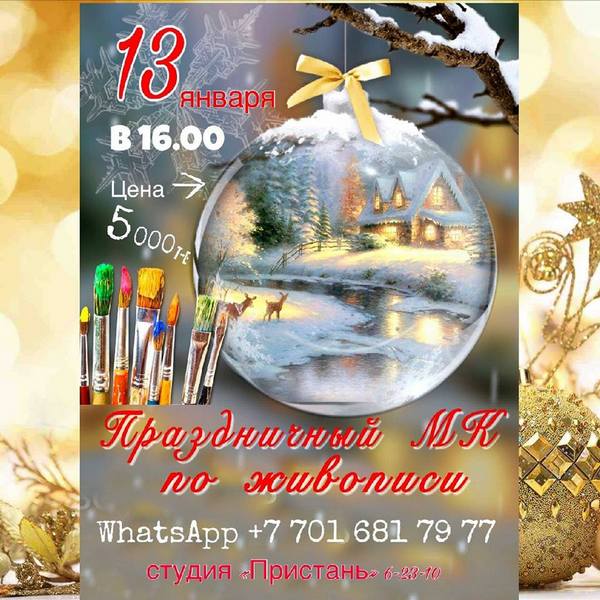 В субботу, 13 января, в 16:00 в студии «Пристань» по адресу 6-23-10 состоится мастер-класс по живописи для взрослых. Проведите вечер в творческой атмосфере, почувствуйте себя художником! Мир искусства прекрасен и увлекателен! Мастер-класс проводит опытный преподаватель и художник Инна Ермакова. Стоимость 5000 тенге. Предварительная запись по тел.: 53-05-85, 8 701 681 79 77.