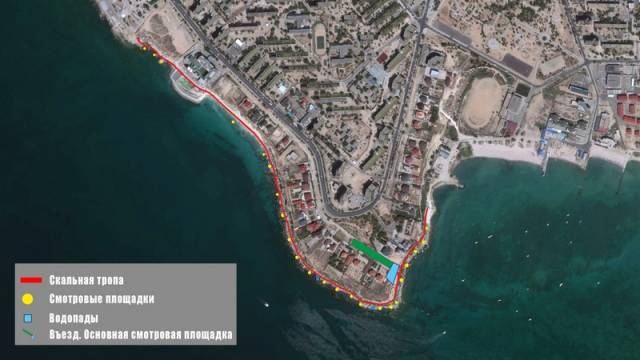 По проекту, на побережье разместят смотровые площадки, тротуары и скамейки. Скалы планируют подсветить и проектировать на них изображения. Строительство планируют завершить за год. При строительстве тротуаров авторы проекта обещают не нарушать естественный рельеф побережья. Разработкой проекта за счёт бюджетных средств занимается компания «Винитол».