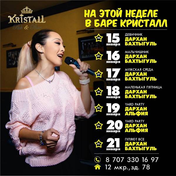 «Кристалл» приглашает провести выходные дни в отличной обстановке. Телефон для справок и бронирования столиков: 8 707 330 1691.