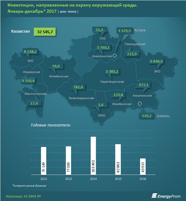 В Западно-Казахстанской области с января по декабрь 2017 года на мероприятия по охране окружающей среды потратили 8 138,2 миллиона тенге. В Восточно-Казахстанской области инвестировали 6 646,5 миллиона тенге. В Атырауской области в экологическую безопасность вложили 4 310,4 миллиона тенге.
