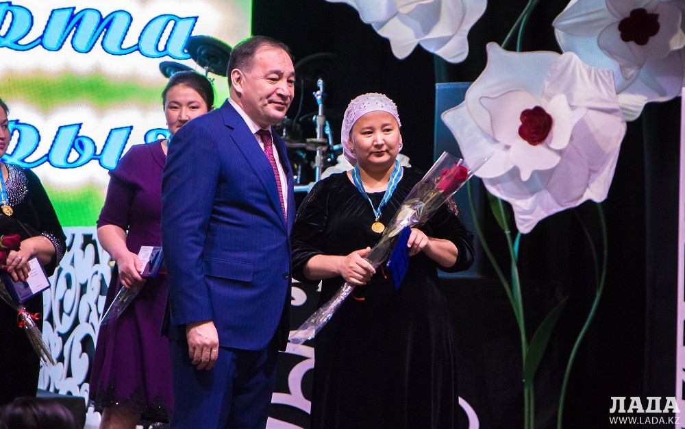 Подвесками «Алтын алқа» наградили семерых женщин, которые воспитали более семи детей. Еще 12 многодетным мамам, которые воспитали более шести детей, вручили подвески «Күміс алқа».