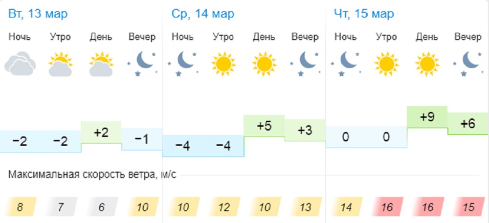 В среду, 14 марта, синоптики прогнозируют солнечную погоду, возможна переменная облачность. Температура воздуха днем составит +6°С, ночью +3°С. Ветер 7-8 м/с.