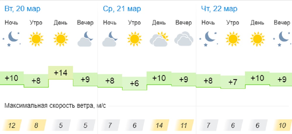 В среду, 21 марта, синоптики прогнозируют солнечную погоду, возможна незначительная облачность. Температура воздуха днем составит +10°С, ночью +7°С. Ветер 2-4 м/с.