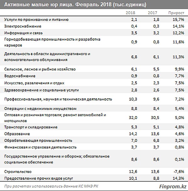 Наиболее активно, по данным Finprom.kz, малый бизнес работает в сфере оптовой и розничной торговли (32 тысячи субъектов), образования (14 200 юридических лиц) и строительства (12 600 субъектов).