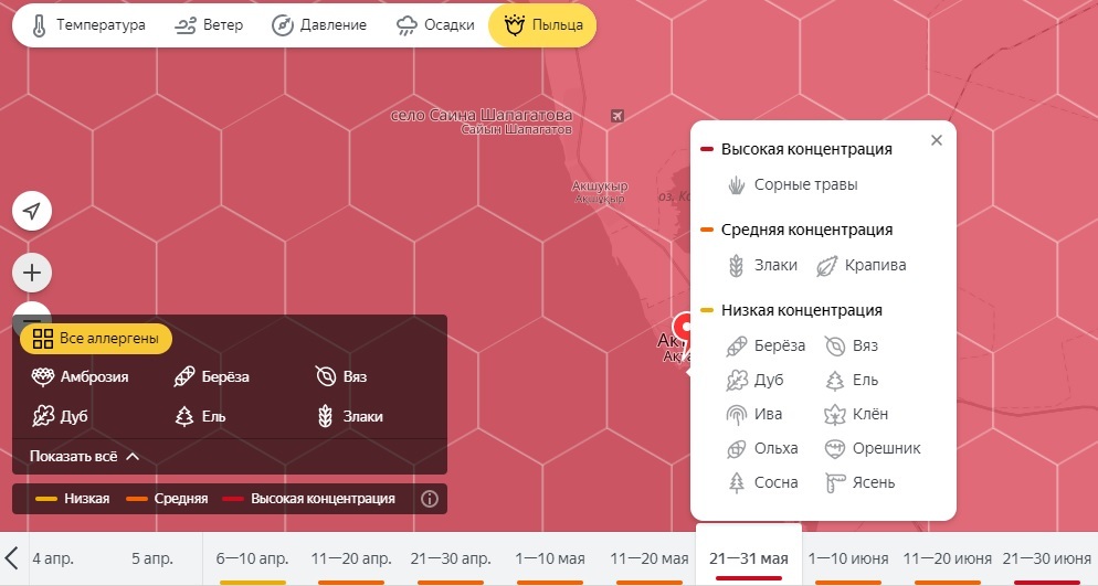 - Учёт актуального прогноза погоды позволяет «Яндекс.Погоде» сообщать даже о той пыльце, которую приносит ветер из других регионов. Например, присутствие пыльцы ольхи и орешника в Актобе может быть отмечено, даже когда эти растения не цветут в городе. Прогноз максимально детализирован и рассчитывается с точностью до районов города, - сообщили в пресс-службе компании «Яндекс».