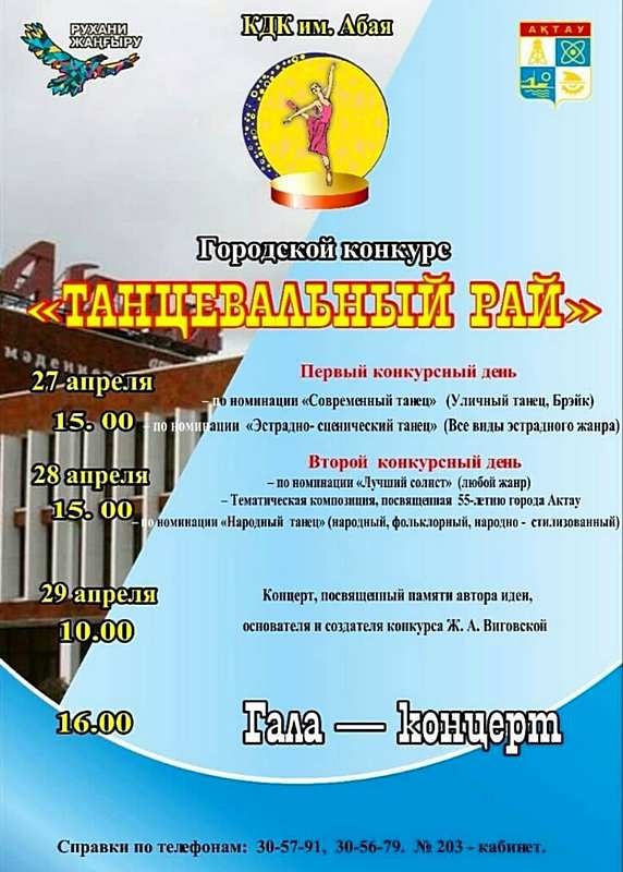 В выходные дни в КДК имени Абая пройдет ежегодный конкурс танцевальных коллективов. Концерт посвящен памяти Виговской Жанетты Аркадьевны. Вход свободный. Телефон для справок: 30 56 70.