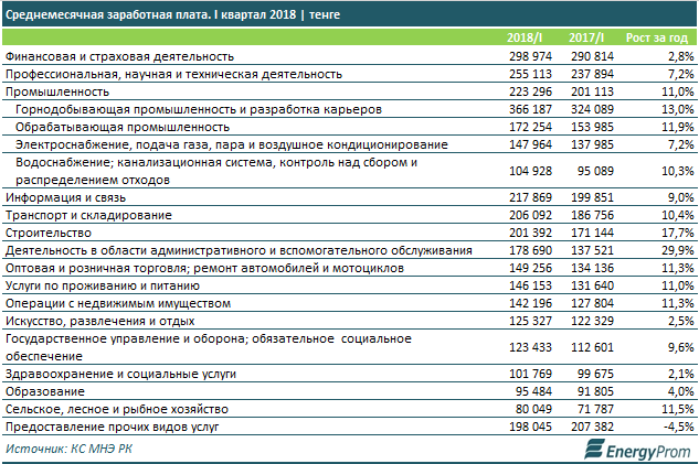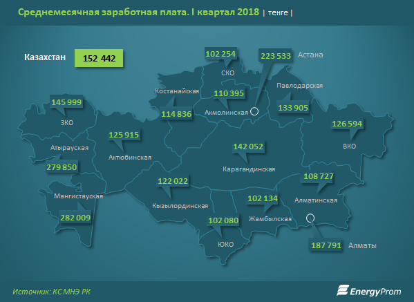 Размер среднемесячной заработной платы в I квартале 2018 года в Казахстане составил 152 442 тенге, что на 8,7% выше, чем в аналогичном периоде прошлого года.