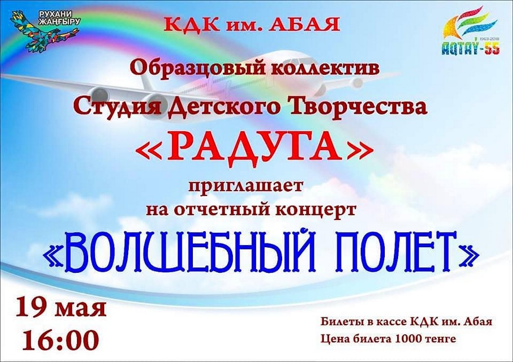 В субботу, 19 мая, в 16:00 жителей Актау приглашают на отчетный концерт «Волшебный полет» студии детского творчества «Радуга». Концерт пройдет на сцене культурно-досугового комплекса имени Абая. Цена билета - 1000 тенге.