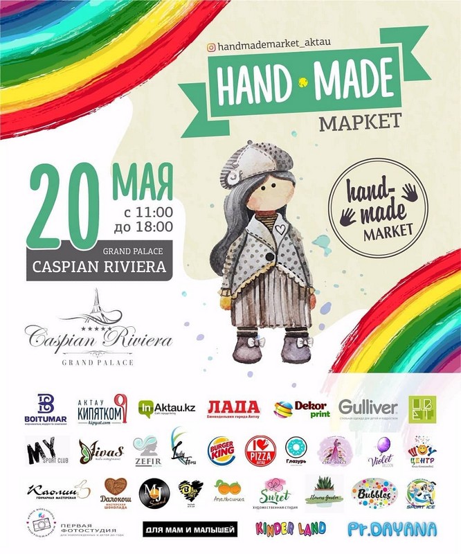 В воскресенье, 20 мая, жителей Актау приглашают посетить Handmade-ярмарку. Вход свободный. Время проведения с 11:00 до 18:00. Ярмарка пройдет в Caspian Riviera Grand Palace, 4 микрорайон.